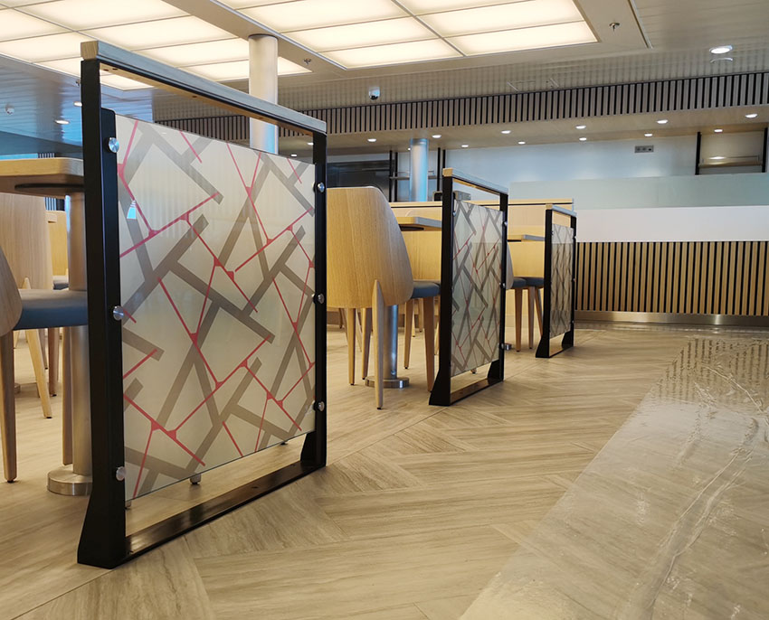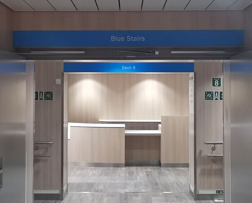 DFDS 船長(zhǎng)214米,寬27.8米,3090米車道,可載乘客890人,船員110人。設(shè)計(jì)吃水6.4米,1C冰級(jí)符號(hào),入級(jí)DNV-GL船級(jí)社,雙機(jī)雙槳,配置3臺(tái)側(cè)推,大大提高了船舶的可操作性,以及靠離港工作效率。我司承接船上指示標(biāo)識(shí)(包含吊式指示標(biāo)識(shí)、艙室門(mén)牌、墻面指示標(biāo)識(shí)、數(shù)字指示標(biāo)識(shí)、梯道標(biāo)識(shí)、Car Deck標(biāo)識(shí)等)、商業(yè)標(biāo)識(shí)(不銹鋼字、3M玻璃膜、裝飾畫(huà)、不銹鋼印刷)的設(shè)計(jì)、制作與安裝工作。